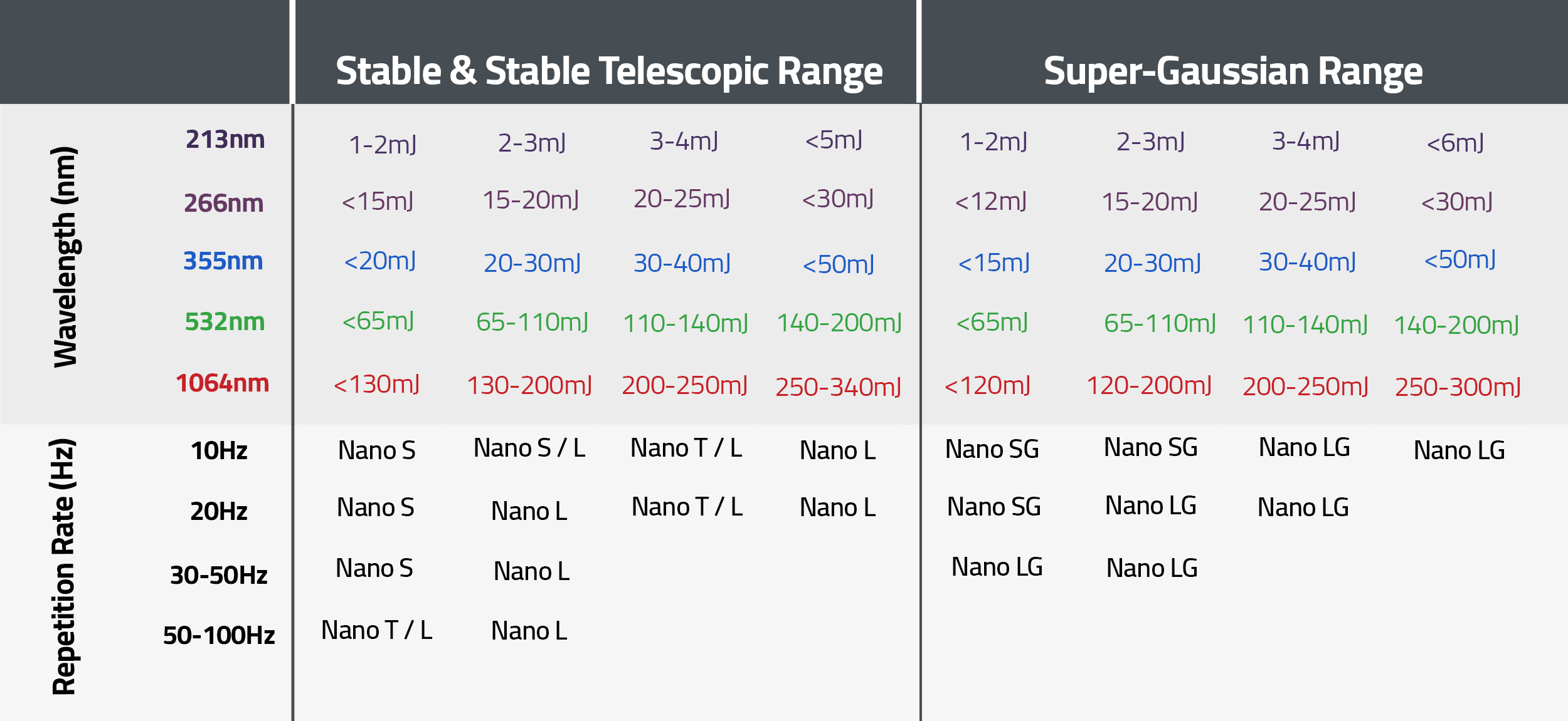Output energies up to 340mJ at 1064nm. Repetition rates up to 300Hz.