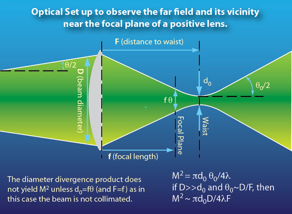 The optical set up depicted here can be used to measure both the beam divergence and the M2 value of a real laser. A lens of focal length 1 or 2m is typically used, along with attenuation optics and the beam is imaged using a CCD and software.